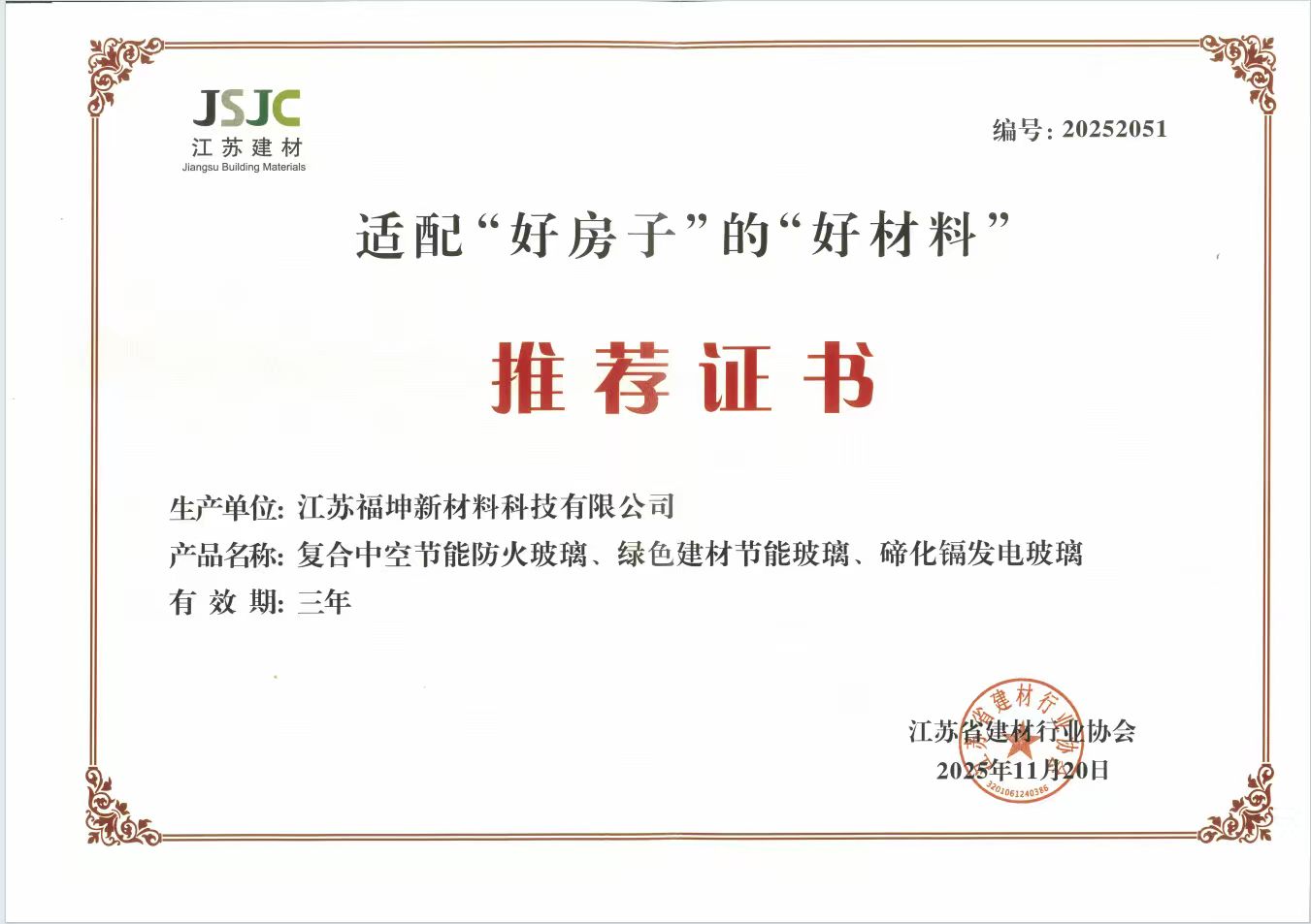 江蘇福坤新材料科技有限公司始創(chuàng)于2007年,總部設(shè)在江蘇省泰興市城區(qū)工業(yè)園莊基路1號(hào),是蘇中地區(qū)玻璃深加工行業(yè)最具競(jìng)爭(zhēng)力的企業(yè)之一。 近年來(lái)公司產(chǎn)品通過了CQC中國(guó)質(zhì)量認(rèn)證中心3C認(rèn)證、ISO9001:2008質(zhì)量體系認(rèn)證、美國(guó)SGCC安全認(rèn)證、澳洲STA標(biāo)準(zhǔn)認(rèn)證、綠色工廠認(rèn)證等。目前公司有18項(xiàng)技術(shù)和產(chǎn)品獲得了國(guó)家專利,有3種產(chǎn)品獲得了國(guó)家節(jié)能產(chǎn)品認(rèn)證。…